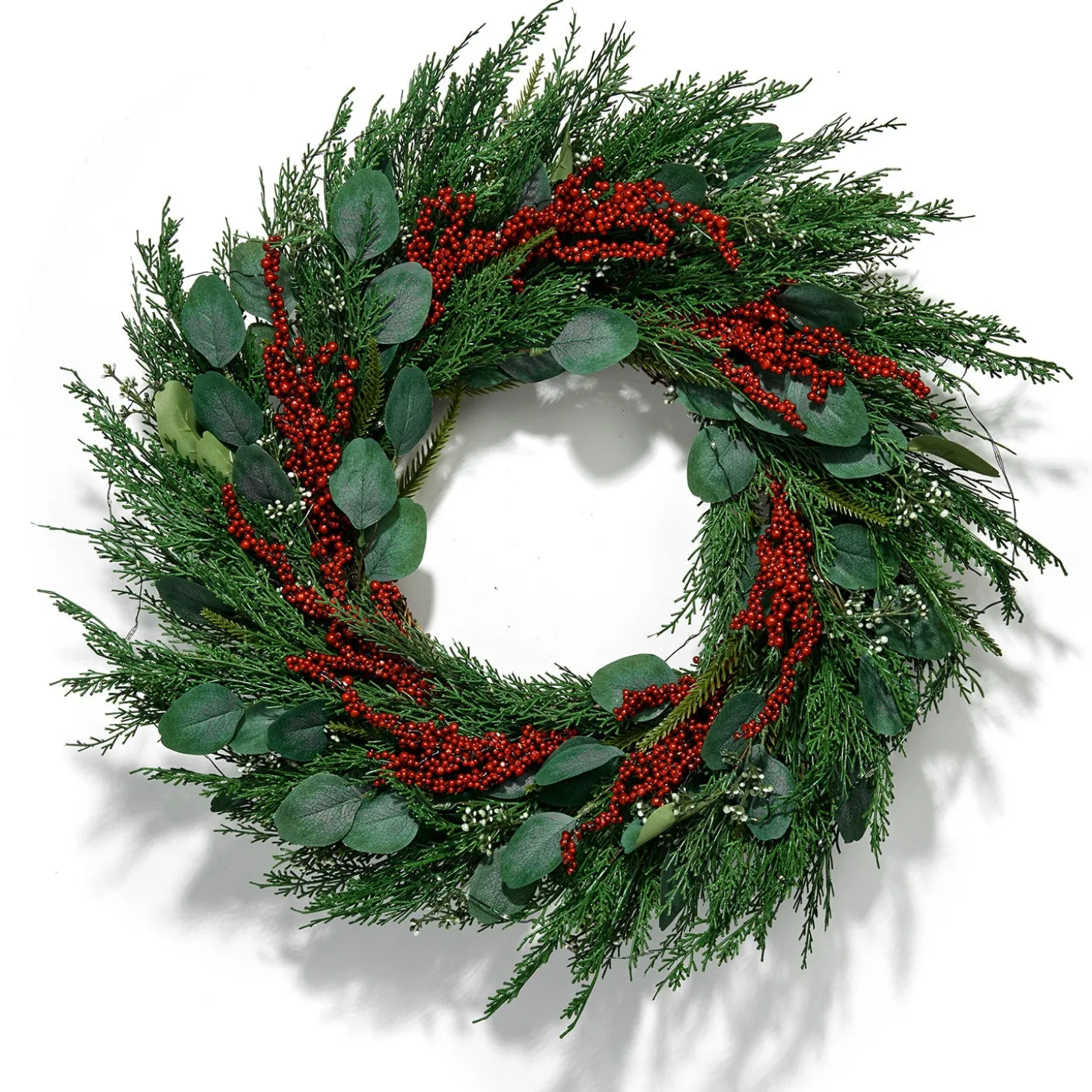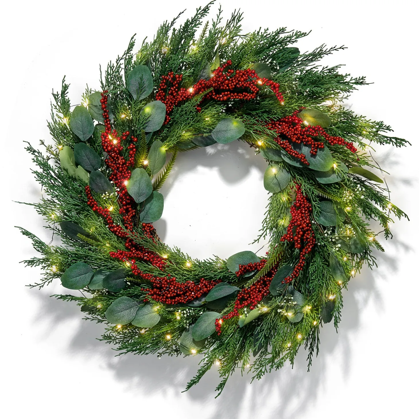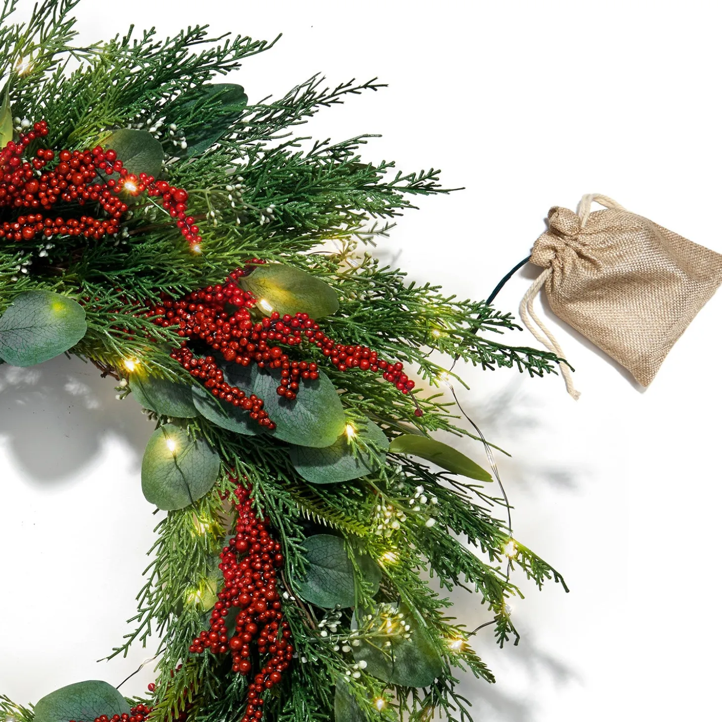 • One 24″ wreath of lush artificial cypress, seeded eucalyptus, and hemlock, topped with red winterberries, and pre-lit with warm white LED fairy lights