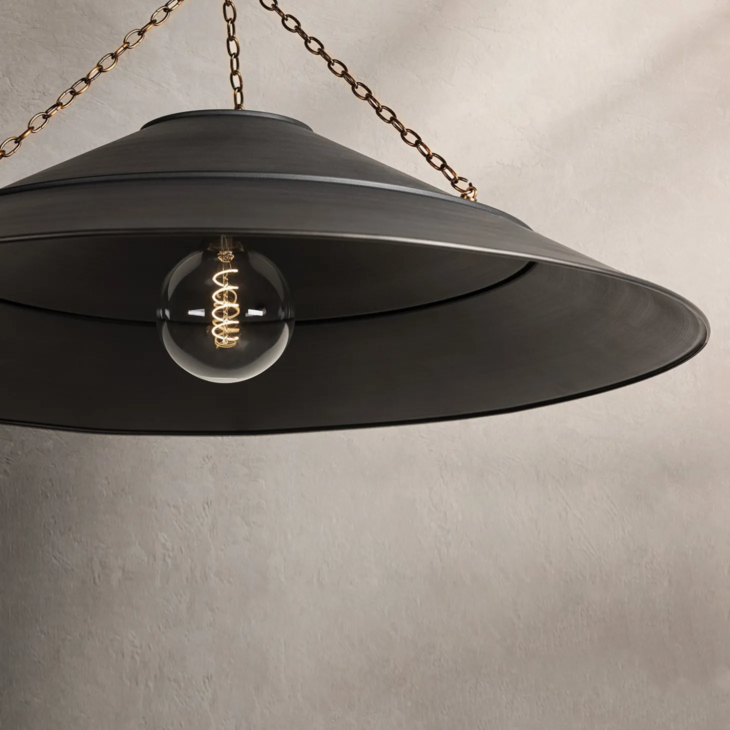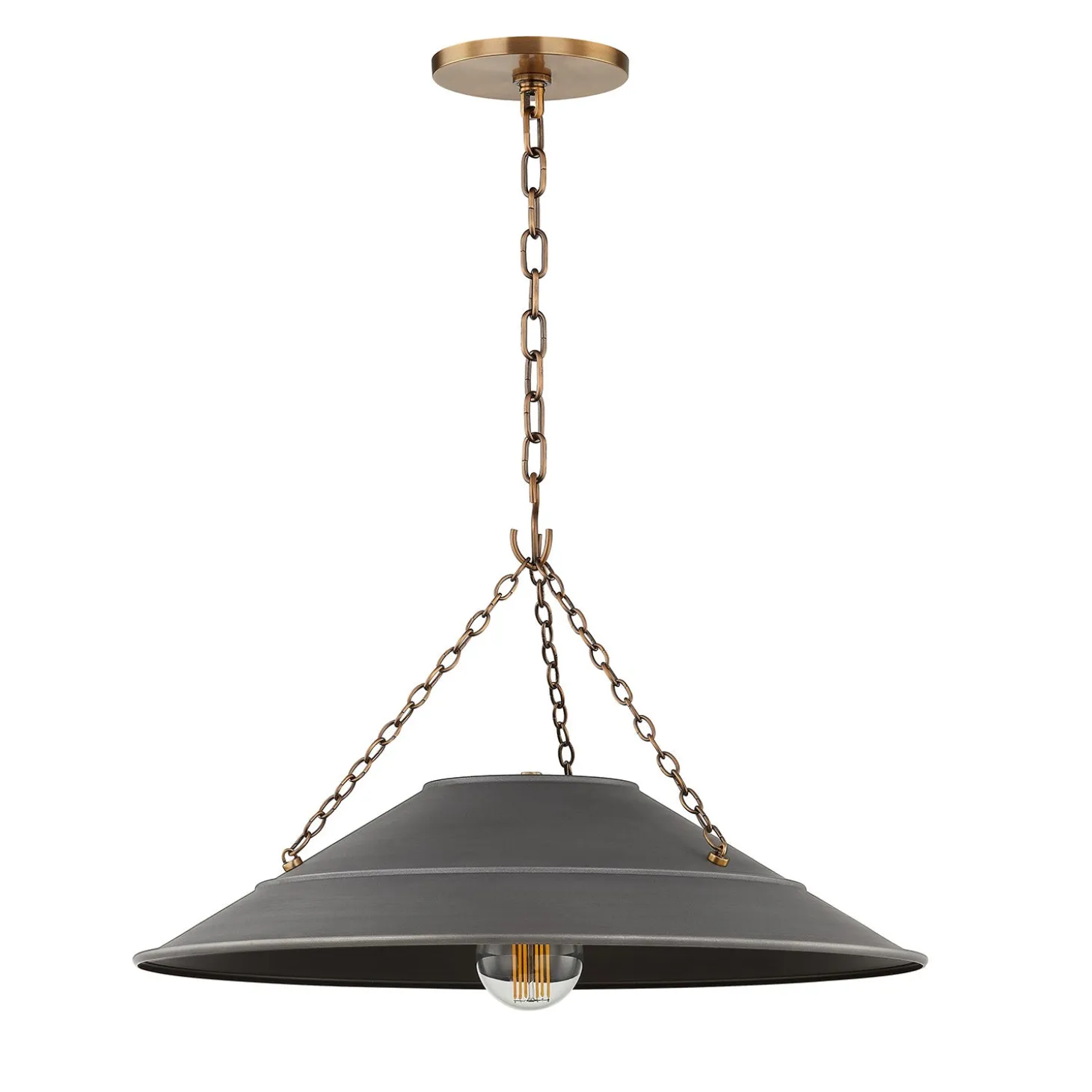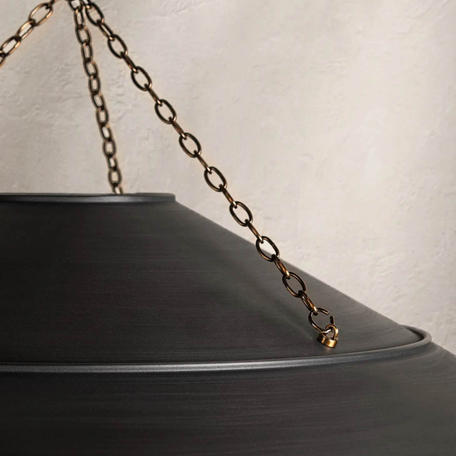 The Zane Pendant light makes a bold statement with its striking metal-work inspired design and rich finishes. The 23″ round graphite shade paired with the patina brass chains and canopy creates a sophisticated two-tone effect, and adds a touch of industrial-modern elegance to any space. A twisted black fabric cord is a subtle detail that gives the pendant a vintage feel. Adjustable height, swag and sloped ceiling compatible, the Zane Pendant becomes a stunning focal point wherever you install it; Perfect in kitchens, entryways, dining areas, or offices.