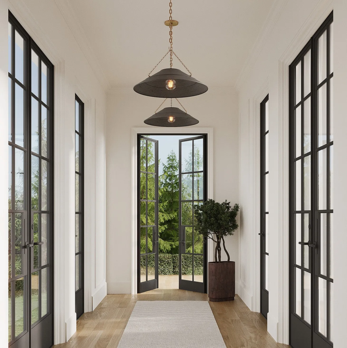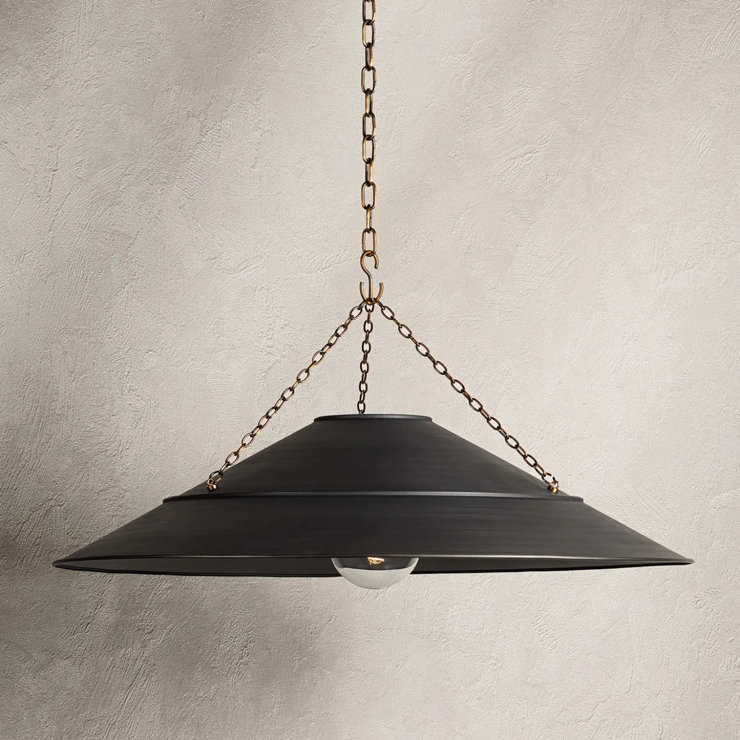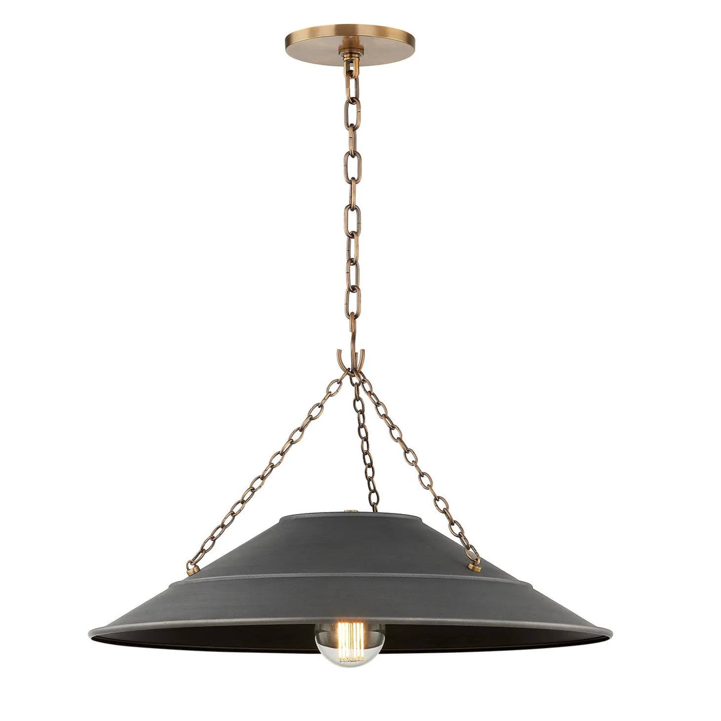 The Zane Pendant light makes a bold statement with its striking metal-work inspired design and rich finishes. The 23″ round graphite shade paired with the patina brass chains and canopy creates a sophisticated two-tone effect, and adds a touch of industrial-modern elegance to any space. A twisted black fabric cord is a subtle detail that gives the pendant a vintage feel. Adjustable height, swag and sloped ceiling compatible, the Zane Pendant becomes a stunning focal point wherever you install it; Perfect in kitchens, entryways, dining areas, or offices.